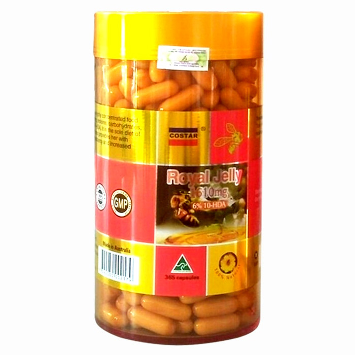 - Viên Uống Sữa Ong Chúa Royal Jelly 1610mg hộp 365 viên bổ sung thêm axit sữa Ong Chúa hay còn gọi là Axit 10-hydroxy-2decenoic là một chất dinh dưỡng đặc biệt chỉ được tìm thấy duy nhất có ở trong Sữa Ong Chúa tự nhiên, ngoài ra còn được được bổ sung thêm 6% 10mg HDA giúp tăng khả năng bồi bổ sức khỏe, tăng cường sức chịu đựng, làm đẹp da, ngừa nám tàn nhang phòng ngừa ung thư.
