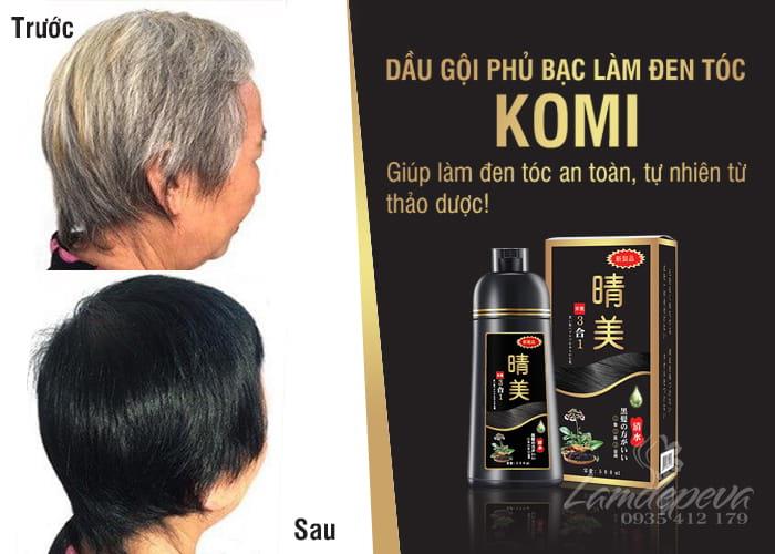 - Dầu gội phủ bạc Komi là một sản phẩm làm đen tóc số 1 tại Nhật. Nó không phải là thuốc nhuộm độc hại, mà chiết xuất chủ yếu từ các loại thảo dược thiên nhiên, giúp làm đen tóc an toàn, tự nhiên sau mỗi lần gội. Ngoài ra, dầu gội Komi cũng hỗ trợ làm dày tóc, kích thích mọc tóc, giảm gãy rụng, và chăm sóc da đầu khỏe mạnh.