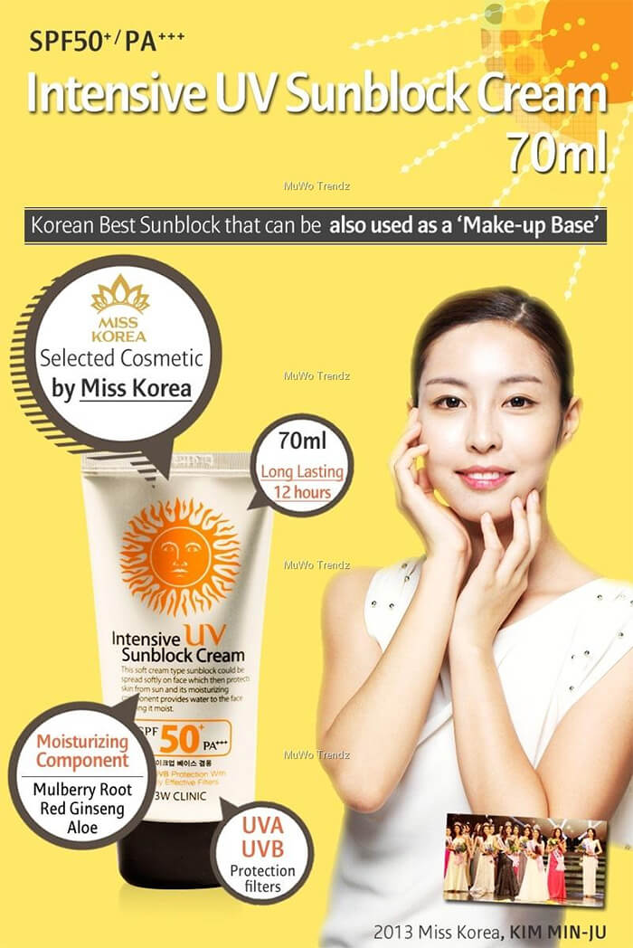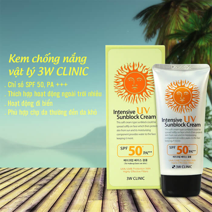 Dựa theo thành phần kem chống nắng 3W Clinic Intensive UV Sunblock Cream SPF 50 PA+++, kem có khả năng chống nắng phổ rộng, tính chất vật lý, dưỡng ẩm, kiểm soát nhờn và chống oxy hóa: