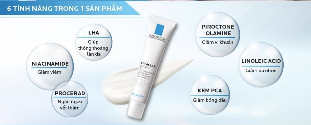 - Kem Trị Mụn La Roche Posay Duo+có một số thành phần nổi bật như Niacinamide giúp xoa dịu vết sưng đau, tấy đỏ của mụn. Piroctone Olamine bảo vệ da, ngăn ngừa sự phát triển của vi khuẩn. LHA/Linoleic Acid làm thông thoáng lỗ chân lông, giảm bớt bã nhờn dư thừa.