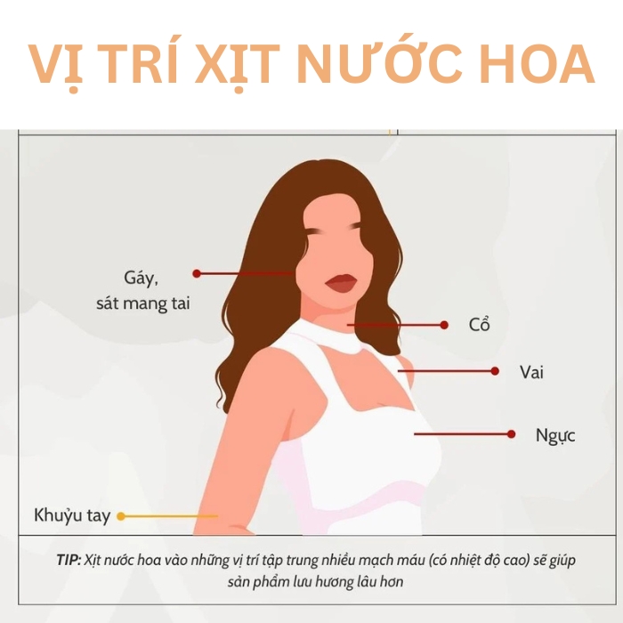 Để nước hoa giữ lâu hơn, bạn có thể xịt lên các điểm mạch như cổ tay, sau gáy và phía sau tai. Ngoài ra, việc xịt nước hoa lên da ẩm sẽ giúp hương thơm giữ lâu suốt cả ngày.