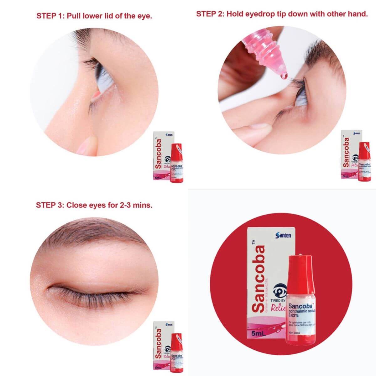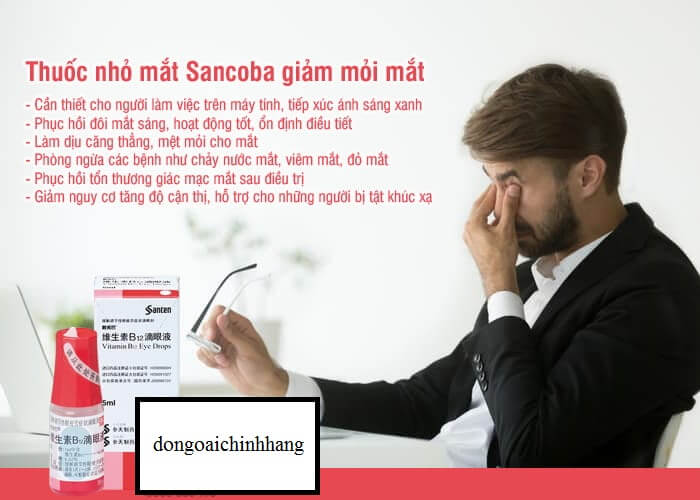 - Thuốc nhỏ mắt Sancoba được điều chế an toàn với tá dược Cyanocobalamin giúp làm giảm mỏi mắt, cải thiện tình trạng mờ mắt, rối loạn điều tiết, mệt mỏi do làm việc, học tập hay ngồi máy tính trong nhiều giờ.