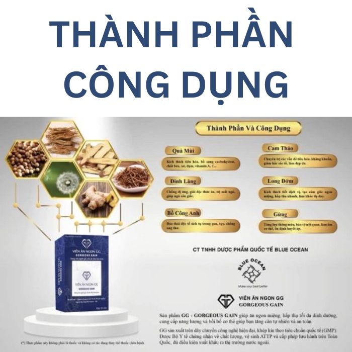 Viên Ăn Ngon GG Gorgeous Gain được chế biến từ các thành phần thảo mộc tự nhiên, an toàn cho sức khỏe và không gây tác dụng phụ. Sản phẩm đã được nhiều người dùng tin tưởng và đánh giá cao về hiệu quả tăng cân và cải thiện sức khỏe tổng thể.