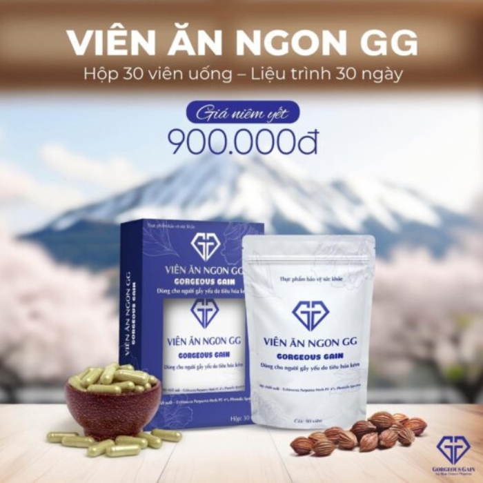 Giá bán: 930000930000930.000₫Viên Ăn Ngon GG Gorgeous Gain là thực phẩm chức năng được thiết kế đặc biệt để hỗ trợ tăng cân an toàn và hiệu quả cho những người gầy yếu, kém ăn hoặc có hệ tiêu hóa kém. Sản phẩm giúp kích thích cảm giác thèm ăn, cải thiện hệ tiêu hóa và tăng cường sức khỏe tổng thể.