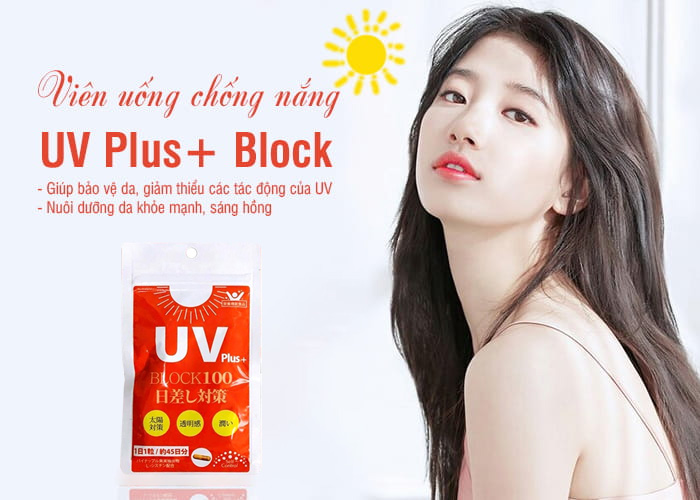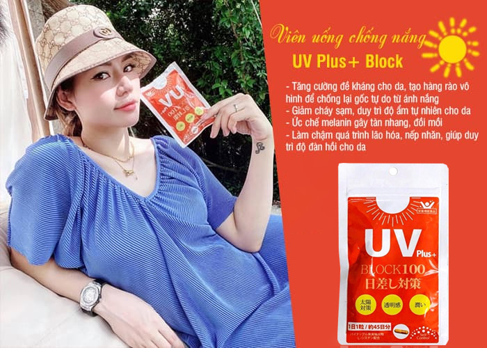 - Viên Uống Chống Nắng UV Plus+ Block100 giúp chống oxy hóa mạnh mẽ, bảo vệ da trước tia UV.