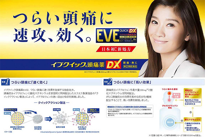- Viên uống giảm đau, hạ sốt Eve Quick DX chuyên trị dứt các cơn đau đầu, đau bụng hành kinh, đau khớp, các chấn thương…một cách nhanh chóng và an toàn nhất. Là sản phẩm lưu hành nội địa Nhật Bản, được sản xuất dành riêng cho người dân sử dụng, chất lượng đảm bảo đạt chuẩn của sở y tế. Eve Quick DX có chứa hàm lượng Ibuprofen kết hợp Allylisopropylacetylurea nâng cao hiệu quả an thần, đồng thời hỗ trợ lưu thông máu huyết toàn cơ thể lấy lại trạng thái cân bằng, làm dịu thần kinh.