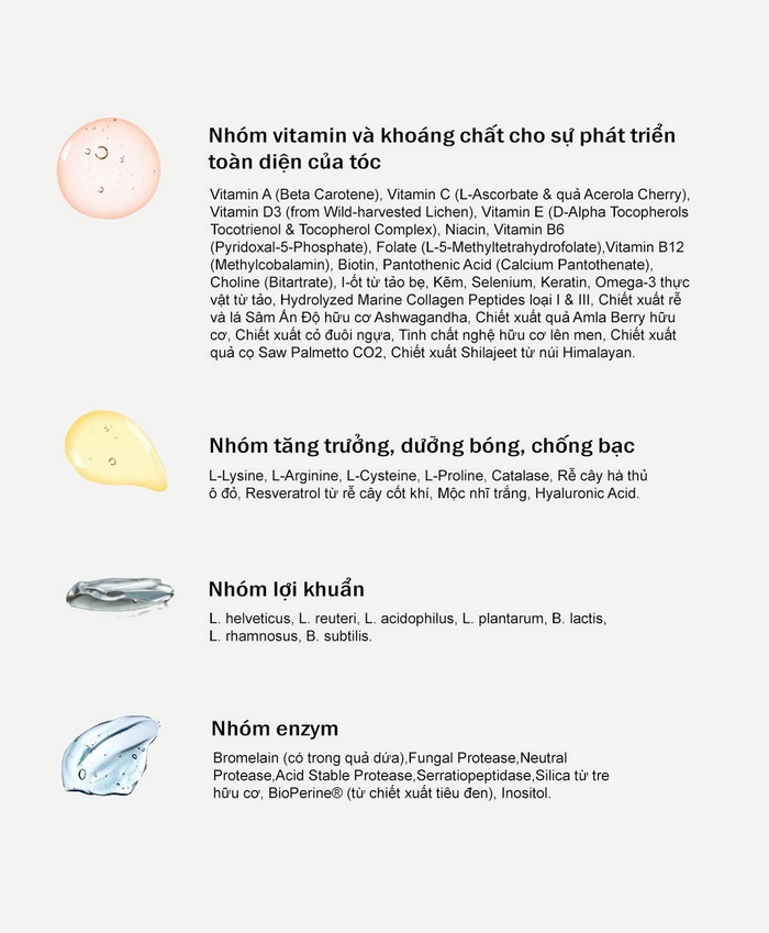 L-Lysine. L-Arginine. L-Cysteine. L-Proline. Catalase.n Rễ cây hà thủ ô đỏ. Resveratrol từ rễ cây cốt khí. Mộc nhĩ trắng. Hyaluronic Acid.