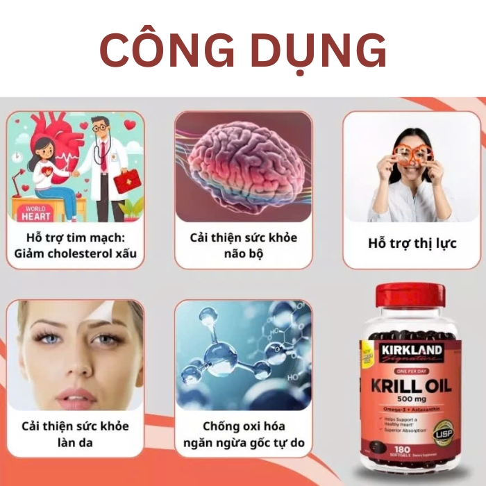 Khi sử dụng đều đặn, sản phẩm giúp cải thiện sức khỏe tim mạch, tăng cường chức năng não, giảm các triệu chứng viêm nhiễm và hỗ trợ hệ tiêu hóa. Ngoài ra, các chất chống oxy hóa có trong dầu tôm còn giúp làm chậm quá trình lão hóa, làm đẹp da và mang lại cảm giác trẻ trung, năng động cho người dùng.