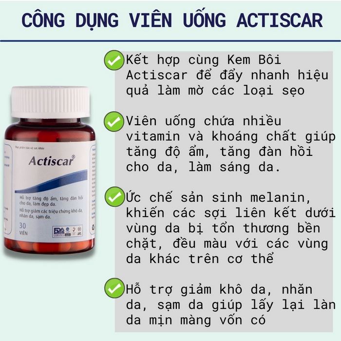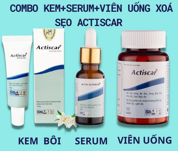 - Viên uống Actiscar kết hợp cùng Kem Bôi Actiscar hỗ trợ đẩy nhanh quá trình làm mờ các loại sẹo