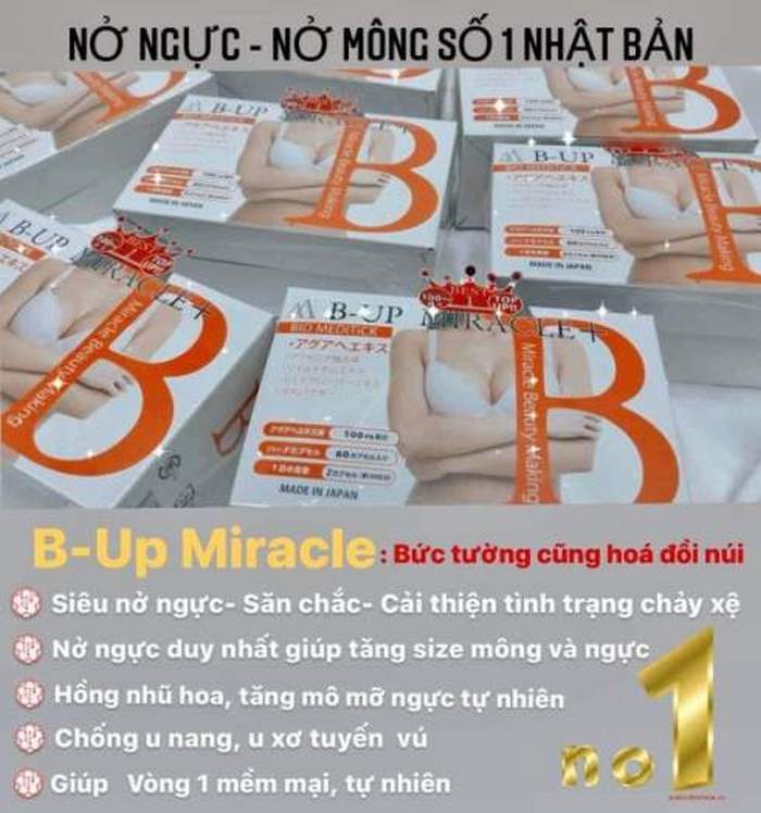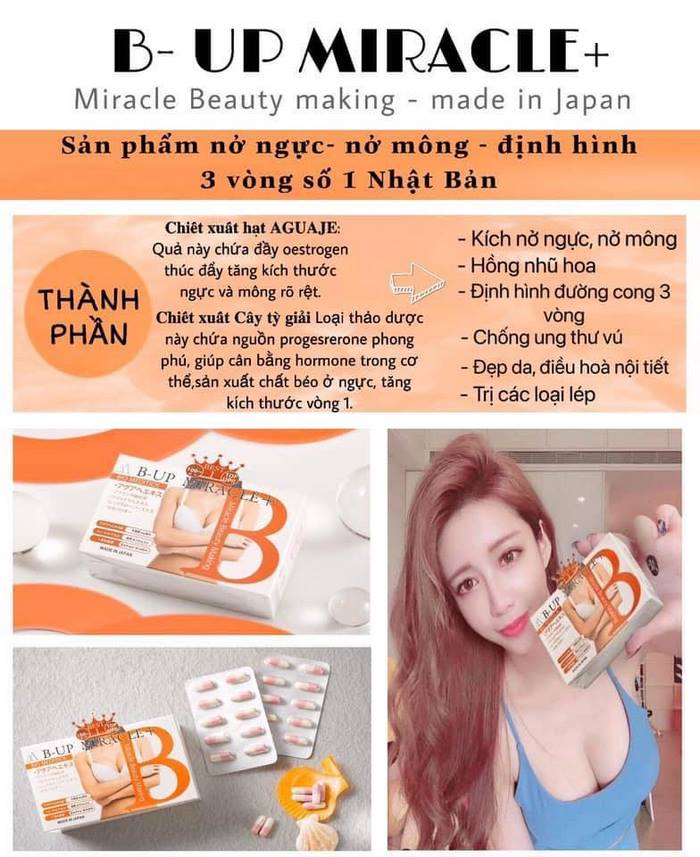 - Viên uống nở ngực, mông B-Up Miracle + được bộ Y tế Nhật cấp phép lưu thông trên thị trường. Công thức độc đáo với chiết xuất Aguaje, tinh chất nhau thai, cây tỳ giải,... Đặc biệt, sản phẩm còn hỗ trợ sức khỏe. Làm đẹp da chống lão hóa, không gây tác dụng phụ.