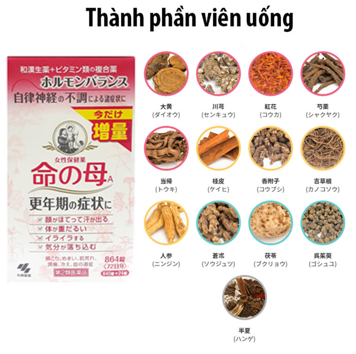 Một hộp viên uống Kobayashi 840 viên Nhật Bản có thể dùng trong khoảng 70 ngày nếu tuân thủ liều lượng 12 viên/ngày. Đây là liệu trình lý tưởng để hỗ trợ cân bằng nội tiết tố lâu dài cho phụ nữ tiền mãn kinh.