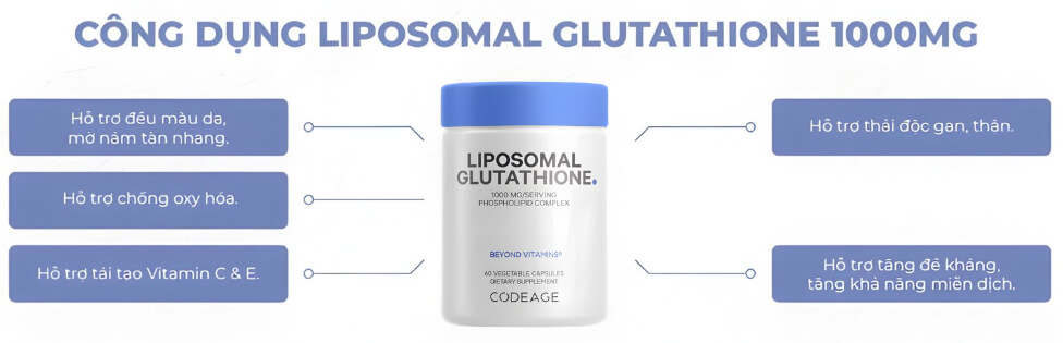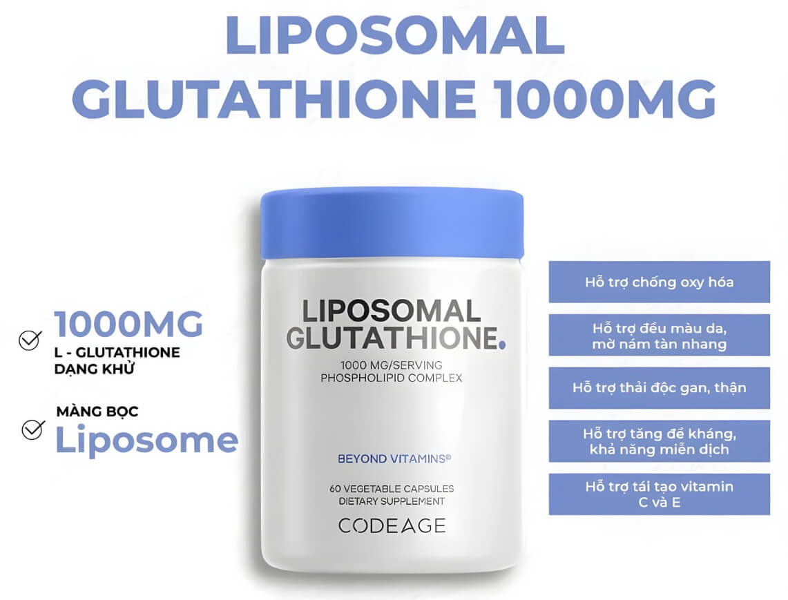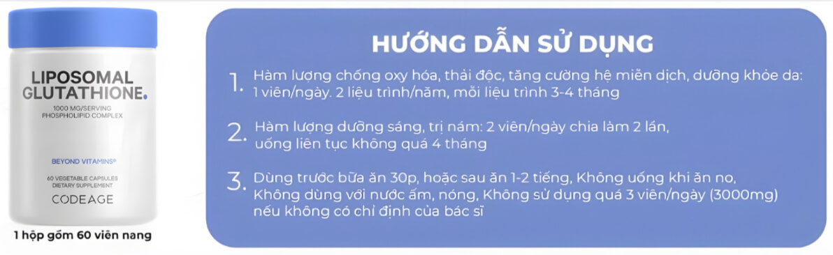 - CODEAGE LIPOSOMAL GLUTATHIONE giúp dưỡng trắng da vượt trội và phù hợp sử dụng bền vững an toàn lâu dài.
