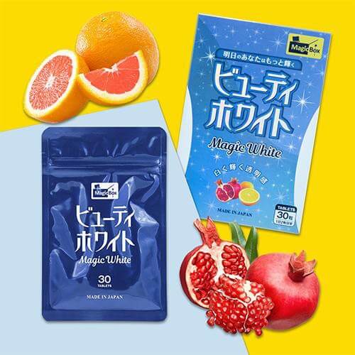 ► Viên uống trắng da Magic White Nhật Bản Hộp 30 viên chứa lượng vitamin C dồi dào từ cam và lựu giúp kích thích sự sản sinh collagen từ các tế bài, bổ sung nguồn collagen dồi dào cho da, giúp làn da căng mịn, đều màu, đồng thời cung cấp đủ nước và vitamin khoáng chất cho da, giúp da duy trì trạng thái căng mịn, hồng hào.