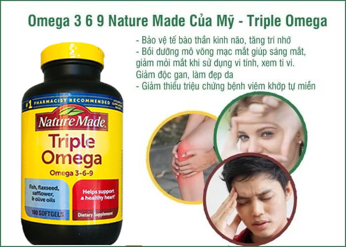 - Triple Omega 3 6 9 Nature Made cung cấp một công thức cân bằng của Omega-3, 6, và 9 axit béo từ một sự pha trộn của cá, hạt lanh, dầu cây rum và các loại dầu ô liu.